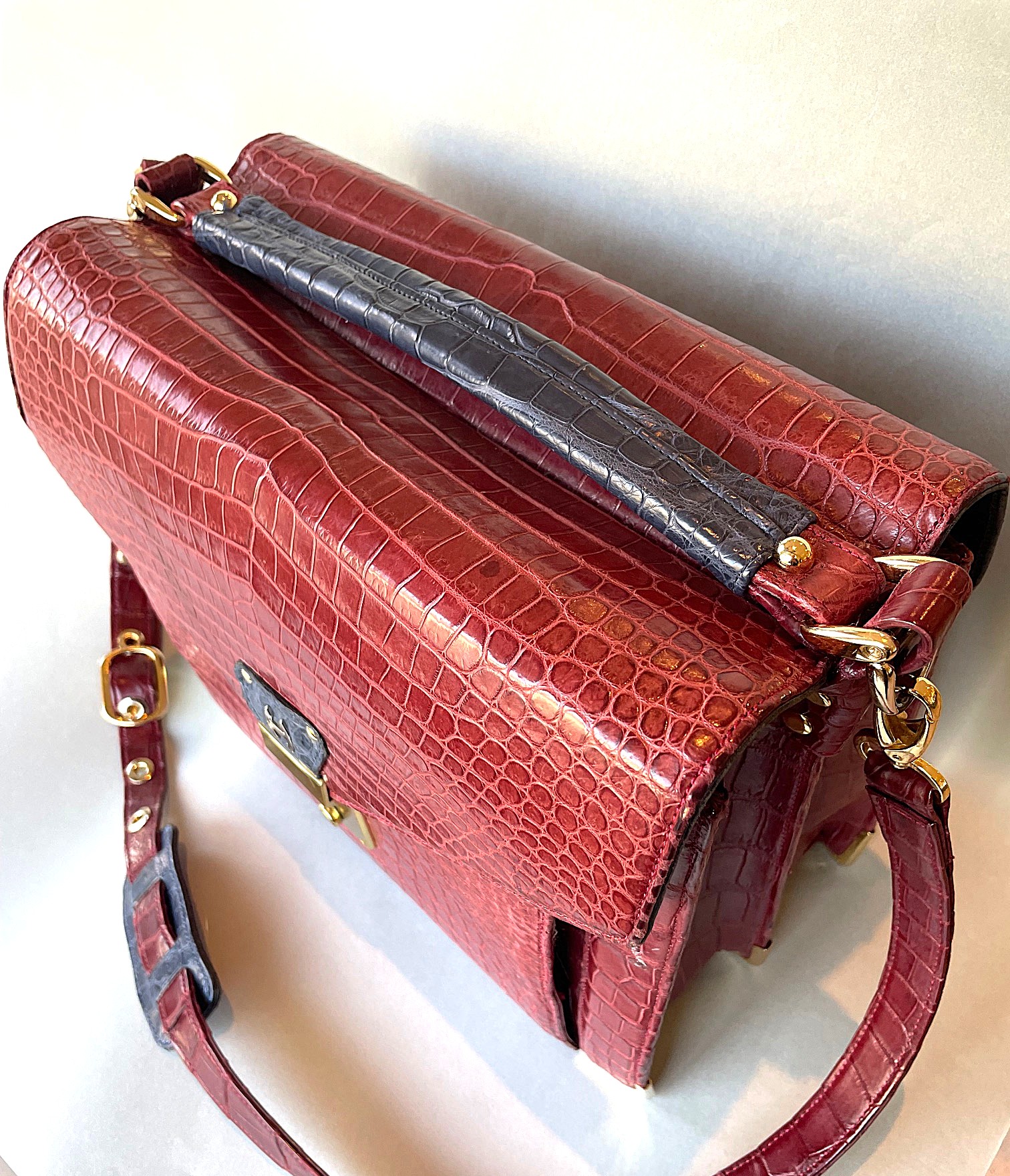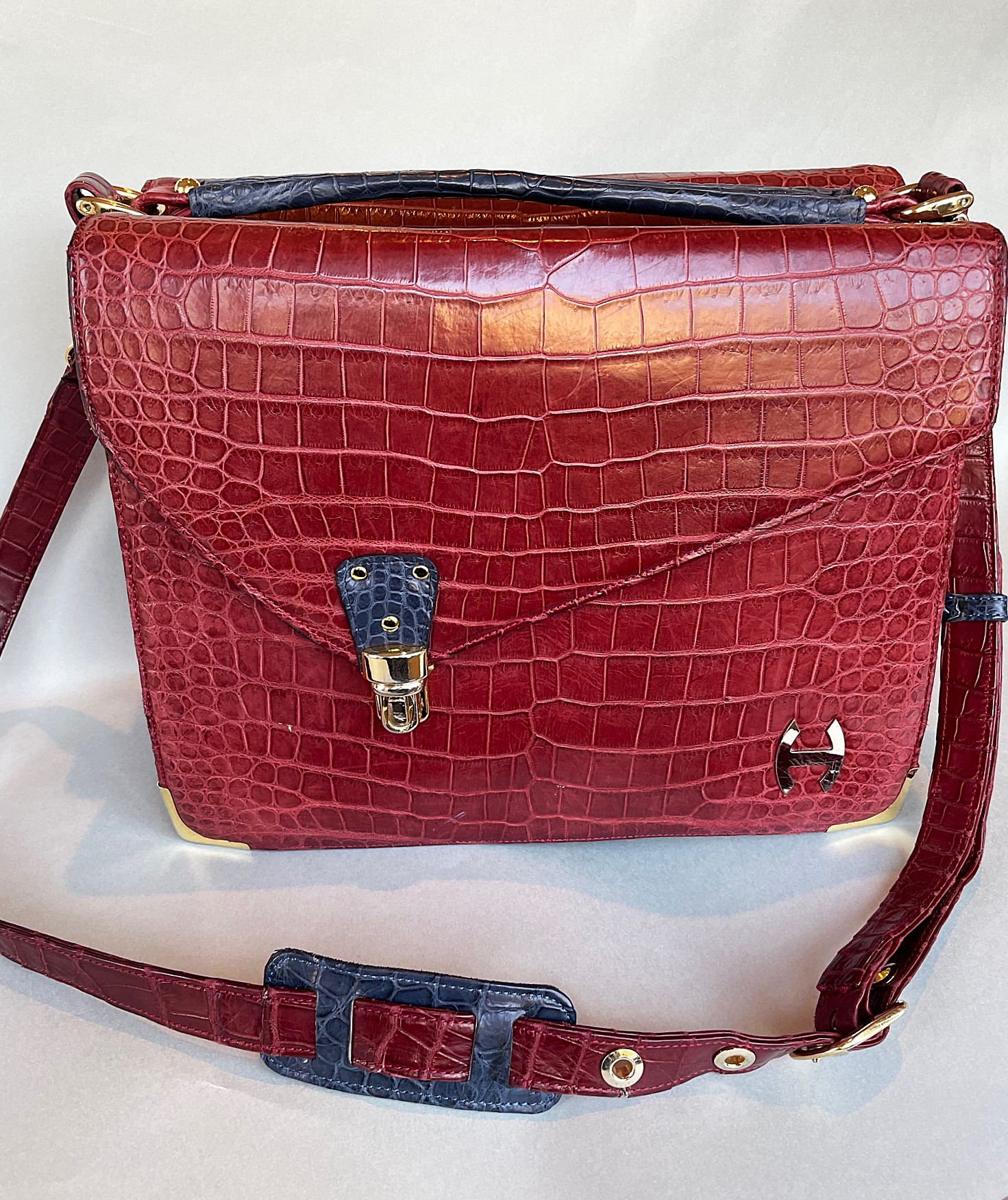 このバッグは、とっても贅沢なバッグで、前にも後にもカブセ(フタ)が付いています。お客様がデザインされたオーダーメード品です。